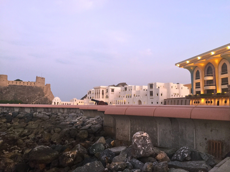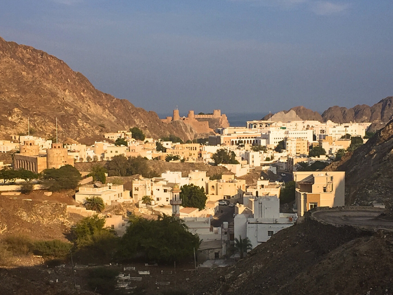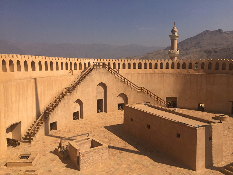 Pri vstupe do Muscatu návštevníkov vítajú pevnosti, postavené na skalných masívoch. Tie sú dejiskom aj portugalskej histórie od 16. storočia. Veď v tom období si privlastnili aj Indický oceán a nazývali ho Portugalským morom. Rušno bolo nielen tu, ale aj vo vnútrozemských oázach a mestách s pevnosťami. Nádherná je pevnosť Nakhla v srdci zelených datľovníkov, či Nizwa, ktorá fungovala ako centrum obchodu, zastávok karaván a náboženstva. Neslúžili len na obranu, ale miestni v nich viedli v celku pohodlný život, o čom nasvedčuje zariadenie. Svojou rozlohou udivuje aj pevnosť Bahla, ktorej obvodové múry akoby nemali v oáze konca. Všetky z nich mali prístup ku vode a aj dnes v ich okolí ostali zavlažovacie kanály, tzv. "falaj".
