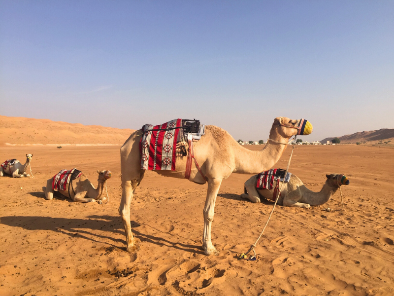 Ku Arábii a púšti patria tradične aj ťavy. Tie sa voľne pasú v oázach, ladnými krokmi zdolávajú jemný piesok v púšti, ba dokonca ich stretnete aj na diaľniciach. Žijú tu čierne, biele a hnedé. Využívajú sa aj na preteky, ktoré sú v krajine veľmi populárne. Údajne tých pretekárskych je v Ománe skoro desaťtisíc! Tiež tu nie je nič nezvyčajné ochutnať ťavie mäso. Domáci ho milujú, najmä grilované. Radi jedia v tradičných reštauráciách, kde sú oddelené salóniky, aby tak každá rodina mala súkromie a najmä zahalené ženy tak môžu v kľude jesť, bez toho aby si ich obzerali cudzí muži. Vo svojich salónikoch jedávajú často aj na zemi a bez príboru. Šikovne si prstami naberú ryžu a mäso. Alkohol v krajine nie je bežné dostať, okrem hotelov. Radi pijú čaj, kávu, či sladký čaj "karak" s mliekom a kardamonom.