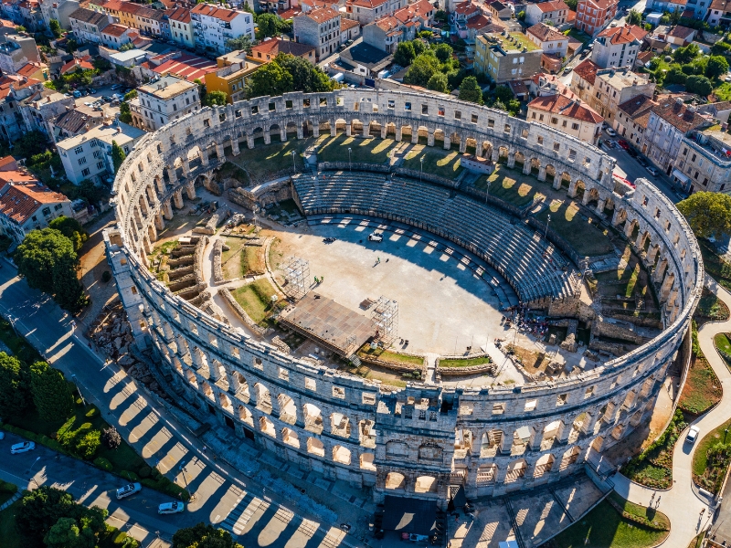 Jedno z najdôležitejších miest na Istrii na vás dýchne históriou. Žiaden div, veď bolo založené už pred tritisíc rokmi. Pri prechádzke mestom uvidíte rímske pamiatky ako Augustov chrám, Víťazný oblúk Sergi, Herkulovu bránu, malé rímske divadlo. Tým najzaujímavejším je však rímsky amfiteáter, ktorý bol postavený približne v rovnakom čase ako Koloseum v Ríme. Ponúkal sedenie pre vyše 20-tisíc divákov, ktorí v aréne sledovali gladiátorské súboje a neskôr rytierske turnaje. Po reštaurátorských prácach sa doňho dnes zmestí asi päťtisíc ľudí a v lete sa používa ako miesto pre festivaly, predstavenia a koná sa v ňom aj miestny filmový festival. Domovom Historického múzea Istrie je Benátska pevnosť. V ňom sú uložené zbierky dokladujúce námornú históriu, mince, zbrane, vojenské vybavenie, staré mapy, pohľadnice a fotografie. Pula je živé mesto s mnohými skvelými reštauráciami, kaviarňami a hotelmi.
