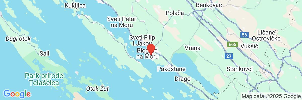na južnom okraji strediska Biograd na Moru • uprostred borovicového lesa • 350 m od hlavnej Biogradskej pláže Soline • 800 m od centra Biogradu • dostupné pešou prechádzkou po promenáde