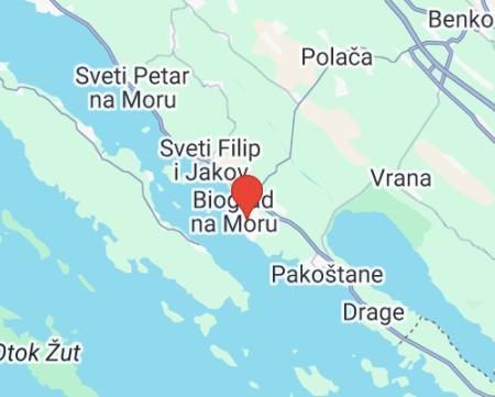 na južnom okraji strediska Biograd na Moru • uprostred borovicového lesa • 350 m od hlavnej Biogradskej pláže Soline • 800 m od centra Biogradu • dostupné pešou prechádzkou po promenáde