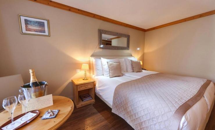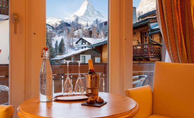 Izba Superior s výhľadom na hory ( 1 miestnosť, priestranná a elegantne zariadená izba s dôrazom na komfort, manželská posteľ (2x 90x200 cm), kúpeľňa s vaňou alebo sprchou a WC, sušič vlasov, župany a papuče, kvalitná hotelová kozmetika, káblová Flat-screen TV, rádio, telefón, trezor, písací stôl, kávovar Nespresso a set na prípravu čaju, minibar, kobercová podlaha, útulné posedenie s kreslami, Wi-Fi zdarma, vlastný balkón s priamym a nerušeným výhľadom na Matterhorn, max. 3 dospelé osoby )