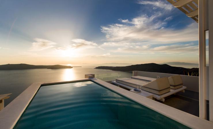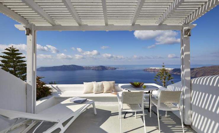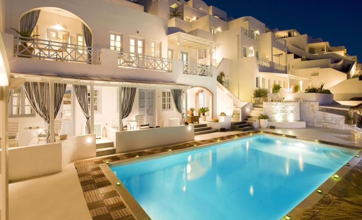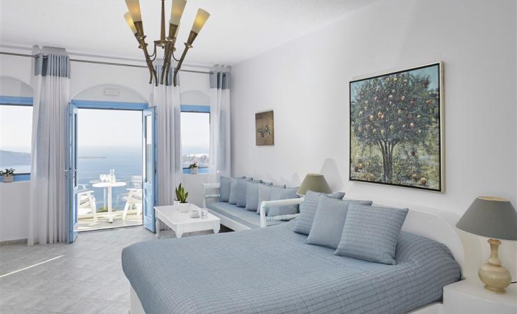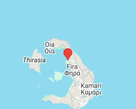 nachádza sa v malebnej dedinke Imerovigli • cca 300 metrov nad kalderou • hlavné mesto Fira vzdialené cca 2 km • medzinárodné letisko vzdialené cca 15 km