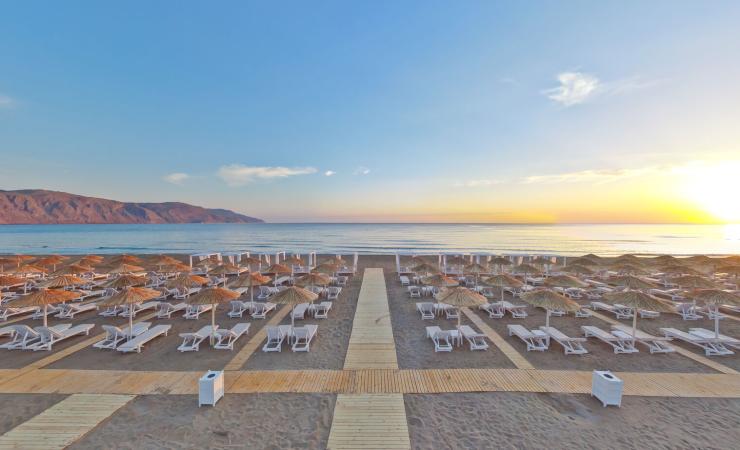 cca 150 m od pláže s jemným pieskom a pozvoľným vstupom do mora (cez podchod popod komunikáciou) • slnečníky, ležadlá a plážové uteráky zdarma • vodné športy za poplatok