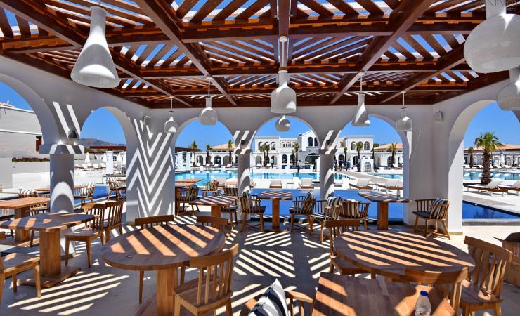 Meltemi (hlavná, bufetová, grécka a medzinárodná kuchyňa, vegetariánska, vegánska aj gluten free strava možná na vyžiadanie) • Ostria (à la carte, Meat and grill) • Levantes (à la carte, grécka kuchyňa) • Brasserie (à la carte, mediteránska, chuťovky) • Sirocco (à la carte, morské plody) • Kaze (à la carte, ázijská kuchyňa)