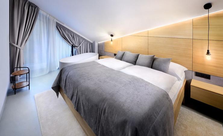 • Apartmán Exclusive s privátnou vírivkou – cca 41 m², oddelená spálňa, možnosť prístelky, terasa s výhľadom a exteriérová vírivka. K pekným detailom patrí welcome prosecco, župany, minibar, trezor aj Wi‑Fi