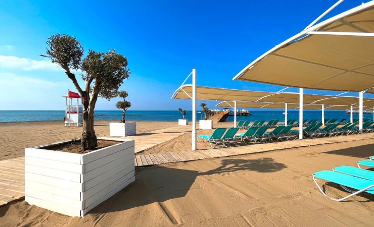 široká piesočnato-kamienková pláž • pozvoľný vstup do mora • mólo • ležadlá, slnečníky, matrace a plážové osušky zdarma • vodné športy (za poplatok) • plážový bar • kabany (za poplatok) • kurzy potápania (za poplatok)