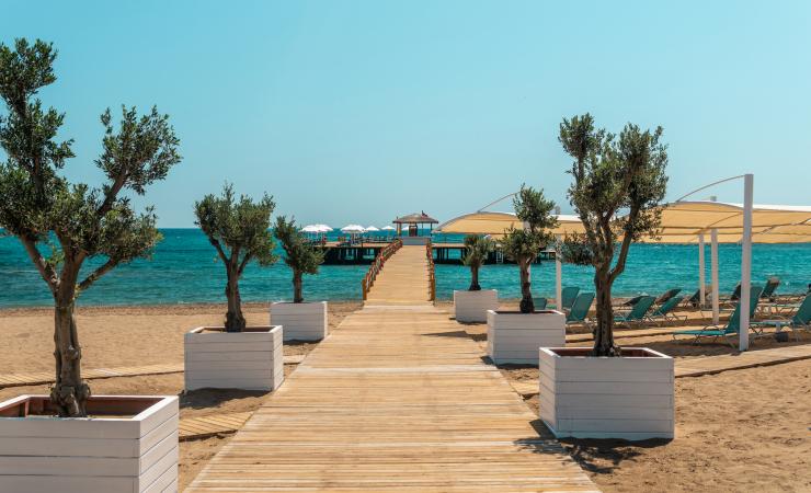 široká piesočnato-kamienková pláž • pozvoľný vstup do mora • mólo • ležadlá, slnečníky, matrace a plážové osušky zdarma • vodné športy (za poplatok) • plážový bar • kabany (za poplatok) • kurzy potápania (za poplatok)