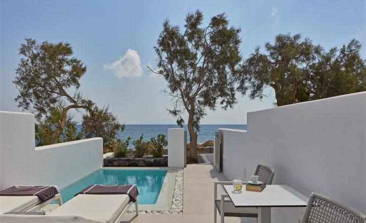 Costa Grand Resort and Spa s typickými bielymi stenami v spojení so svetlým drevom a izby s nádychom jemnej mätovej farby Vás osloví nie len svojim vzhľadom ale aj pohostením a výhľadmi na more. Je letným mestom pre všetkých, ktorí hľadajú skutočnú letnú zábavu a potešenie pod slnkom. Má dokonalú polohu na kozmopolitnej čiernej piesočnej pláži Kamari a ponúka vám dokonalý pocit bosého luxusu priamo na pláži. Je výbornou voľbou pre novomanželov na svadobnej ceste, skupinu priateľov aj pre rodiny.