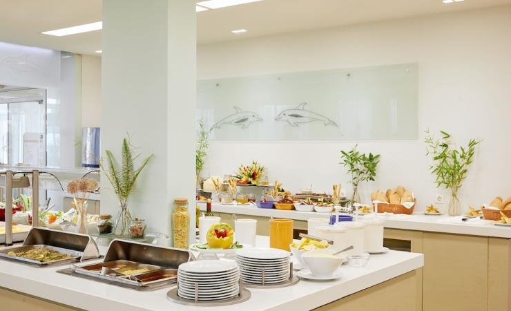 Raňajky a večere podávané formou bohatých bufetových stolov v hlavnej reštaurácii Nafsika • široký výber jedál gréckej a medzinárodnej kuchyne • k dispozícii je plážový bar a snack bar Kirki ponúkajúci ľahké obedy a osvieženie počas dňa • večerný koktail bar s ponukou drinkov