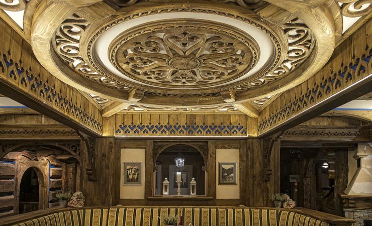 • Reštaurácia Zuzana – goralsko-rusínska výzdoba s drevenými ornamentmi a stromom života nad krbom, symbolizujúca tradície regiónu