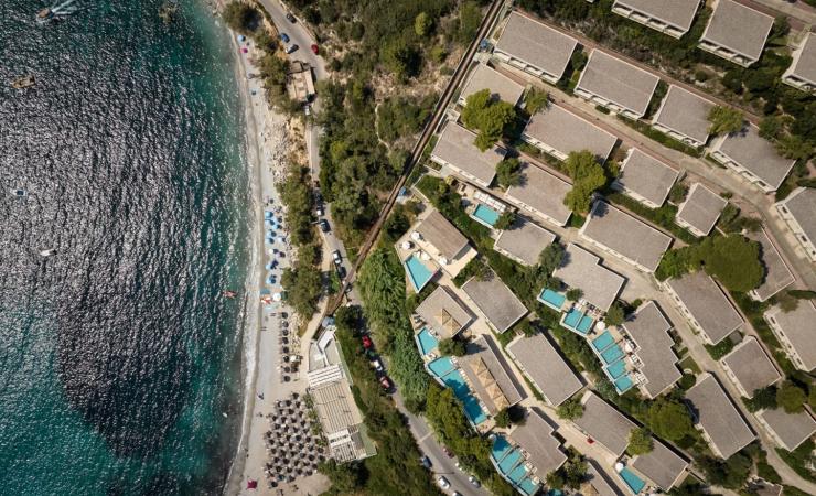západné pobrežie ostrova Korfu, oblasť Ermones • cca 17 km od hlavného mesta Korfu (UNESCO pamiatka) a letiska (cca 25 minút jazdy) • v tesnej blízkosti Corfu Golf Club (cca 1 km) • rezort je situovaný na útese priamo nad malebnou zátokou