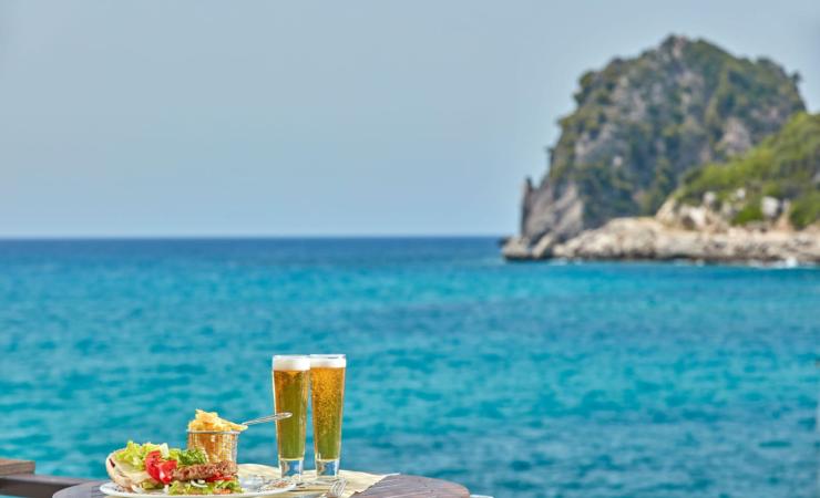 piesočnato-kamienková pláž Ermones ocenená Modrou vlajkou • prístup na pláž je zabezpečený unikátnou hotelovou lanovkou alebo pešo • plážový servis: slnečníky a ležadlá sú pre hostí k dispozícii zdarma • krištáľovo čistá voda ideálna na šnorchlovanie