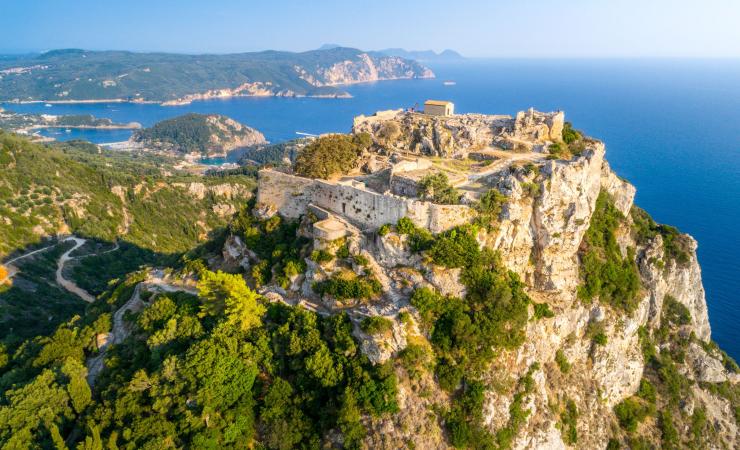 Zrúcaniny byzantskej pevnosti, západne od Paleokastritse. Táto mohutná byzantská pevnosť bola založená približne začiatkom 13. storočia Michaelom I. a neskôr ešte rozšírená Anjou a Benátčanmi, pre nich bolo Angelokastro až do 18. storočia popri Kerkyre najdôležitejším opevnením na ostrove. Za tureckých nájazdov v 16. a 18. storočí sa tu úspešne bránilo niekoľko tisíc ostrovanov.