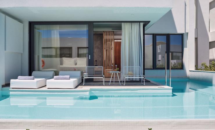 Štandardná izba Deluxe s privátnym bazénom (35 m2, 1 miestnosť pre max. 2 osoby, obývacia časť, výhľad do záhrady alebo na more) • Junior Suita Deluxe (45 m2, 1 miestnosť pre max. 3 osoby, obývacia časť, výhľad na more) • Junior Suita Deluxe s privátnym bazénom (45 m2, 1 miestnosť pre max. 3 osoby, obývacia časť, výhľad do záhrady, na pláž alebo na more)