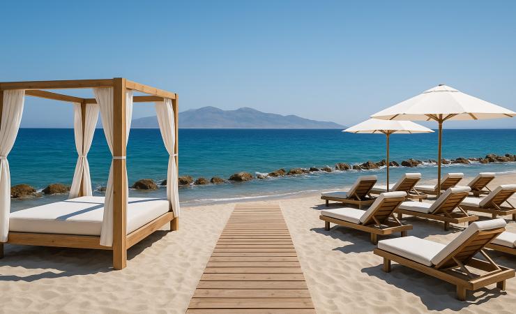 piesočnatá pláž (hrubozrnný piesok) je asi 250 m od hotela • pozvoľný vstup do mora • slnečníky, ležadlá a plážové uteráky (zdarma) • vodné športy (za poplatok) • plážový bar