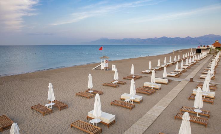 široká piesočnatá pláž ocenená Modrou vlajkou • pozvoľný vstup do mora • mólo • slnečníky, ležadlá, plážové osušky na pláži a pri bazénoch zdarma • plážový bar • kabany (za poplatok)