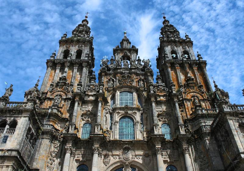 Katedrála sv. Jakuba v Santiago de Compostela bola postavená v 9. storočí, keď biskup Teodomiro označil malý rímsky chrám za hrob apoštola sv. Jakuba, preto kráľ Alfons II. nariadil postaviť okolo pohanskej stavby skromný kostol. Vnútri sú jeho ostatky. Tento Jakub je uctievaný ako národný patrón Španielska. Je symbolom nádeje a ochrancom kresťanskej viery. Znázorňuje sa ako pútnik s klobúkom, mušľou, palicou, alebo na koni s mečom proti nepriateľom. V 11. storočí po arabských útokoch došlo k novej výstavbe v románskom slohu. Katedrála je postavená zo žulových kvádrov a má pôdorys latinského kríža. Bočné kaplnky sú rozmiestnené po celom interiéri. Baroková Svätá brána zo 17. storočia sa otvára iba v jubilejných rokoch. Priečelie Obradoiro z 18. storočia je kombináciou kameňa, skla s pozoruhodným veľkým oknom v strednej časti.