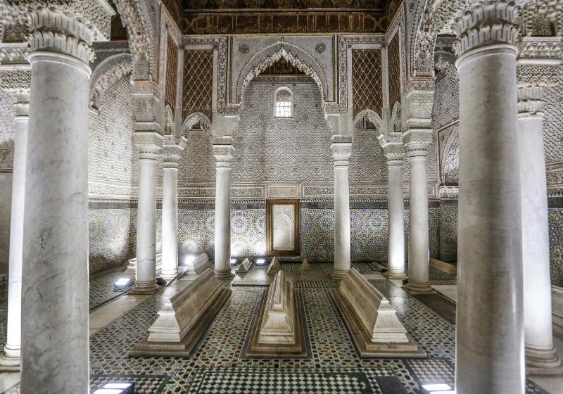 Hrobky dynastie Saadi sa nachádzajú v srdci Marrákešu a boli postavené už na existujúcej nekropole. Toto bolo v Maroku bežné, keďže každá vládnuca dynastia odstraňovala stopy nádhery, ktoré zanechali jej predchodcovia, a zároveň časť tohto dedičstva využívala na vlastné stavby. Sultán Ahmed al-Mansur (1578-1603), súčasník španielskeho Filipa II., nariadil postaviť hrobky ako miesto posledného odpočinku pre svoju matku. Bola známa ako Lalla Masuda a bola mimoriadne dôležitou postavou v dejinách Maroka. Zodpovedala aj za mešitu Bab Doukkala (1557). V hrobkách sú aj pozostatky jej manžela Mohammeda al-Shaykha. Neskôr boli pridané ďalšie miestnosti vrátane mauzólea samotného al-Mansúra a početných vonkajších hrobiek. Toto hrobové miesto sa používalo do roku 1659, kedy zomrel posledný sultán Ahmed al-Abbás. Mulaj Ismail, druhý z jeho nástupcov (z dynastie Alaouitov), ​​prezývaný „krvavý kráľ“, sa rozhodol zablokovať prístup k hrobkám a na takmer štyri storočia sa na ne zabudlo. Keď však bolo mesto počas francúzskeho protektorátu (1917) odfotografované zo vzduchu na účely topografickej štúdie, pri analýze fotografií bol objavený tento rozsiahly priestor vedľa mešity Kasbah. Hrobky sú miestom odpočinku viac ako 60 členov rodiny Saadi a desiatok ďalších pozostatkov, o ktorých sa predpokladá, že patria šľachticom z ich dvora. Mnohým hrobkám chýba nápis ani akákoľvek identifikácia. Interiér vyniká bohatou výzdobou dlaždíc, bielych stĺpov vyrobených z carrarského mramoru a krásne je aj zdobený kazetový strop z cédrového dreva.
