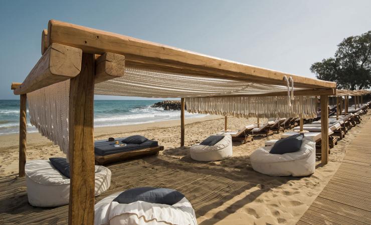 piesočnatá pláž ocenená Modrou vlajkou • pozvoľný vstup do mora • slnečníky a ležadlá (zdarma) • plážové a bazénové osušky (zdarma) • oddelená časť pláže iba pre dospelých • vodné športy (za poplatok) • plážový bar