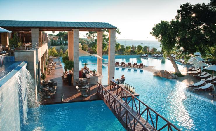 Iliades reštaurácia • bohatý raňajkový bufet • obedy a večere s panoramatickým výhľadom na more • 4 tematické večere do týždňa • Varkarola reštaurácia • stolovanie pod holým nebom so stredomorskou príchuťou • a la carte reštaurácia otvorená na obedy a večere • Bakaliko taverna • tradičná grécka a miestna kuchyňa • s výhľadom na les a na more • a la cart reštaurácia otvorená na večere • Oliveto reštaurácia • talianska kuchyňa • a la carte reštaurácia otvorená na obedy a večere
