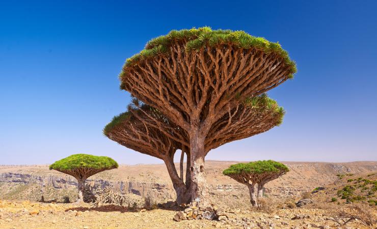 Na sokotranskej plošine Diksam sa nachádzajú ikonické stromy. Arabský názov stromu je „dam al akhawain“ („krv dvoch bratov“), u nás sa používa názov dracéna (druh Dracaena cinnabari), ktorá sa vyskytovala na prakontinente Gondwana. Strom má neobvyklý tvar s mohutnou hustou korunou. Ich živica vo vzduchu tuhne na červenohnedú hmotu, ktorá sa používala na liečenie proti zápalom, ale aj farbenie keramiky a huslí. Tu ich rastie asi 900 000, čo predstavuje 40 % na planéte. Dosiahnuť môžu výšku až 9 metrov.