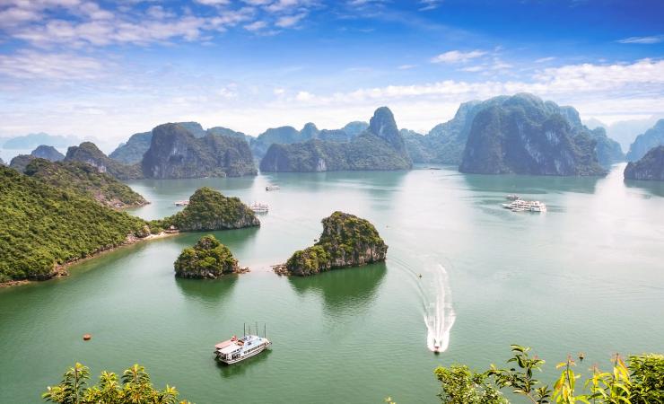 Tyrkysová voda v zálive Halong, lode a skalné ostrovy. Vietnam. Foto: unsplash.com